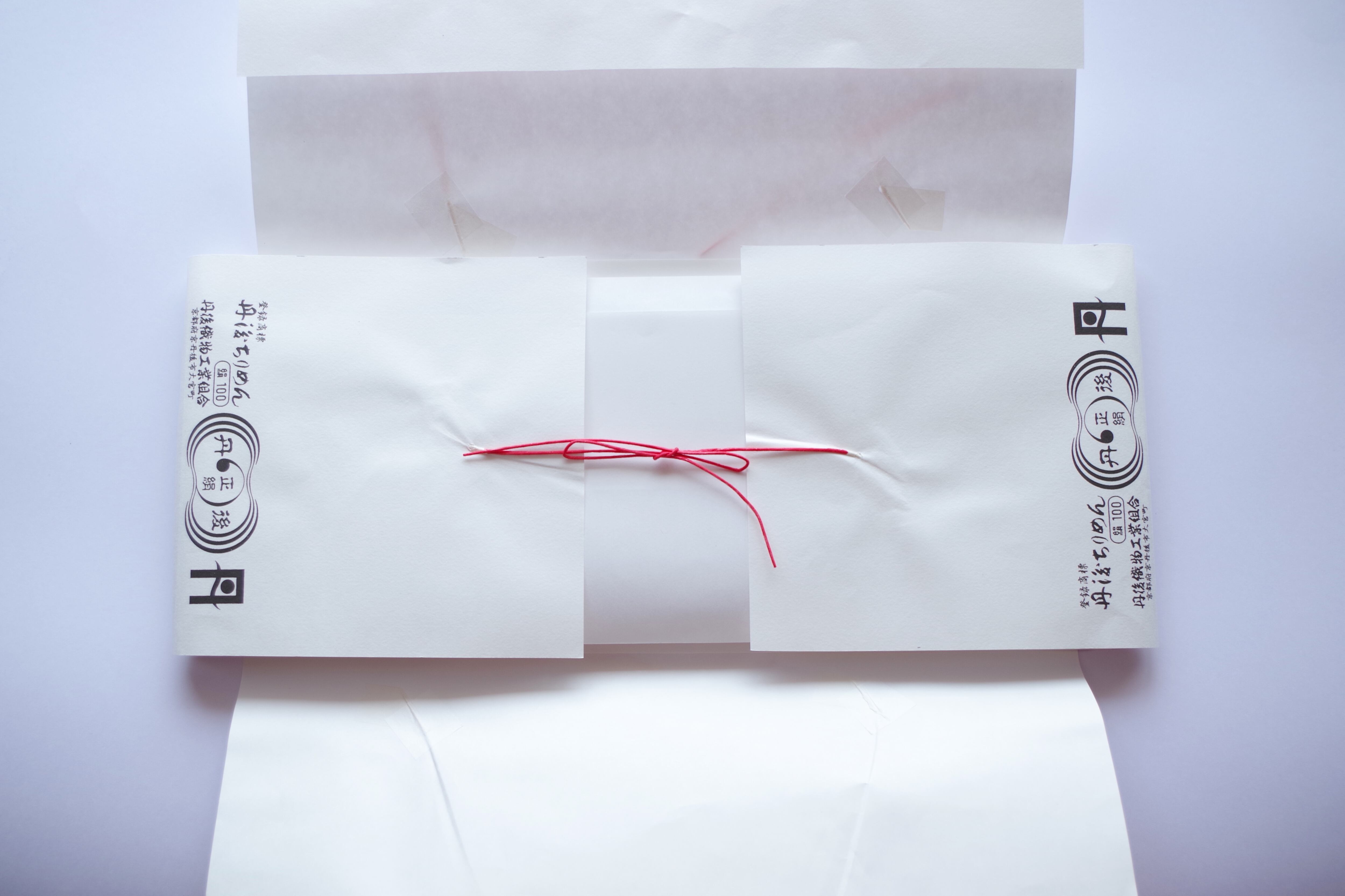 ラッピングは昔から丹後ちりめんの反物を包む、八反文庫と呼ばれる包装紙を使用。